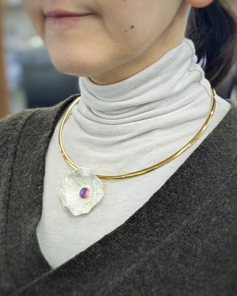 硬度が高く、変形やキズに強く、ハリとしなやかさがあるのでボリュームのある作品も形がくずれず、しっかりとキープしてくれます。金属アレルギーが出にくいのも特徴です。