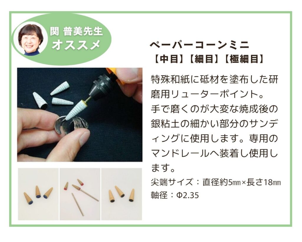 特殊和紙に砥材を塗布した研磨用リューターポイント。手で磨くのが大変な焼成後の銀粘土の細かい部分のサンディングに使用します。専用のマンドレールへ装着し使用します。中目、細目、極細目の3種。