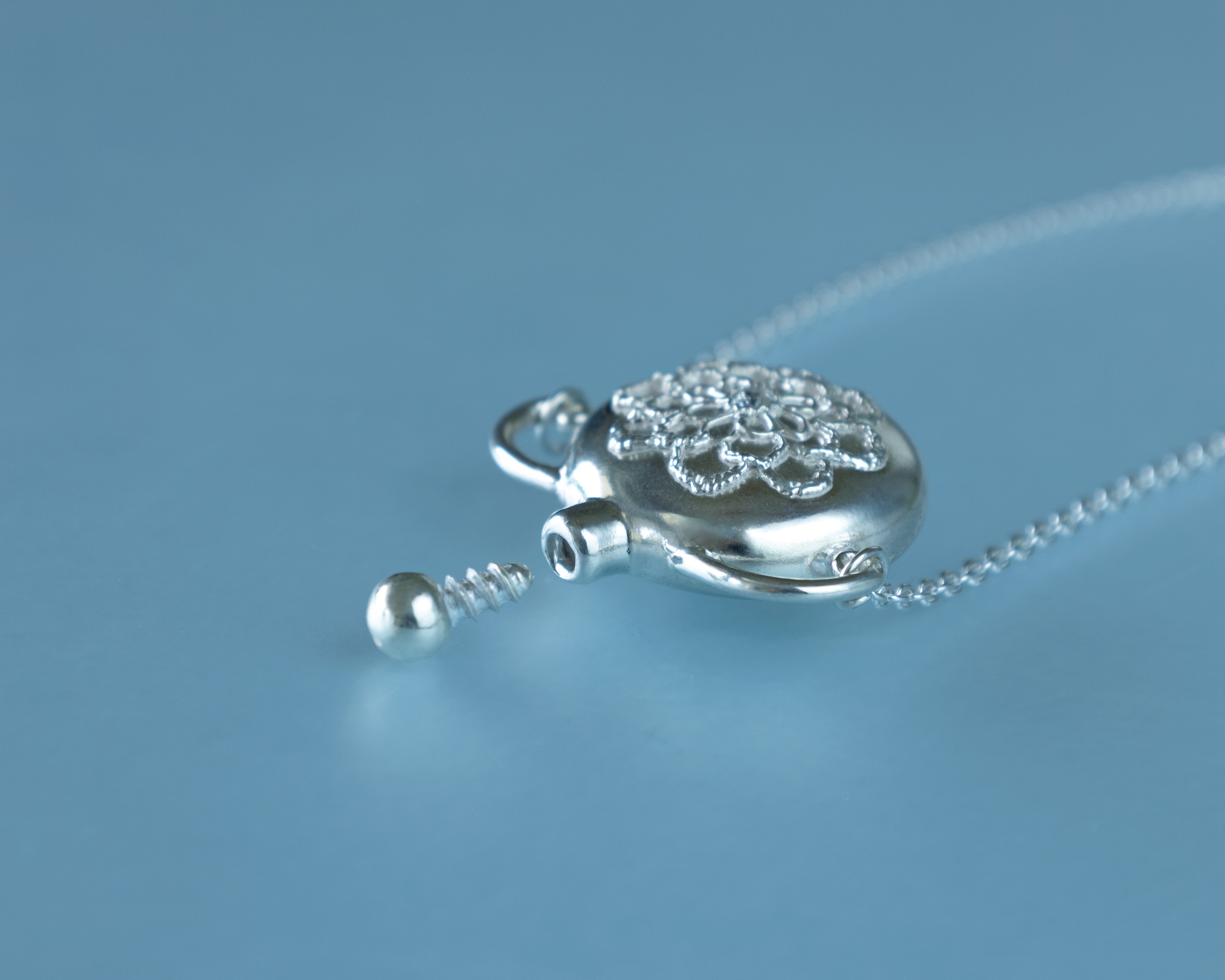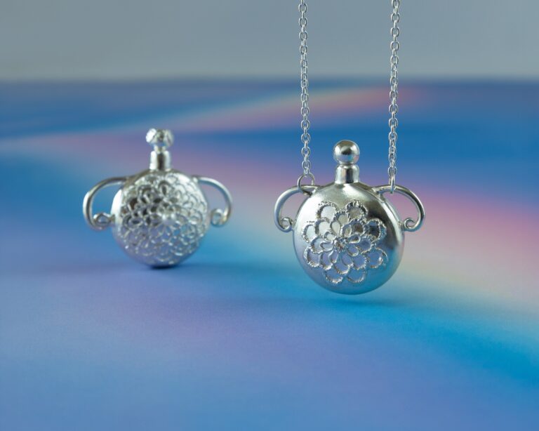 アートクレイシルバーでころんとしたフォルムが可愛らしい香水瓶をつくり、シリンジ技法で繊細なレース模様を描きます。
