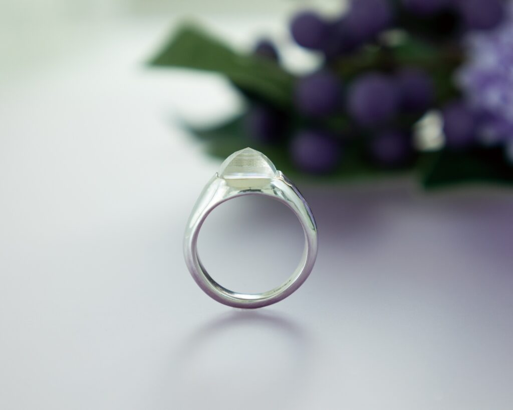 シュガーローフカットとは円錐形に固めた砂糖の塊(シュガーローフ)の形に由来し、上部が丸みを帯びた山型の石は内側からやさしい輝きを生み出します。