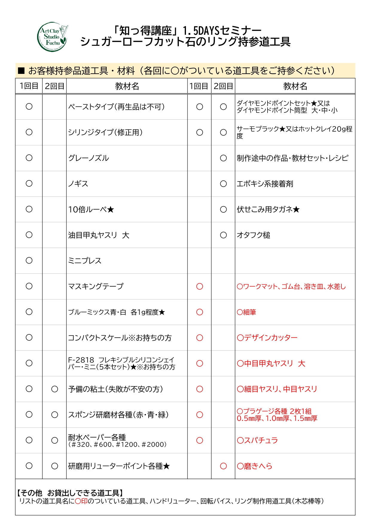 | 申込み後キャンセルされる方は、講座開催日の5営業日前までにアートクレイ工房へご連絡ください。 |