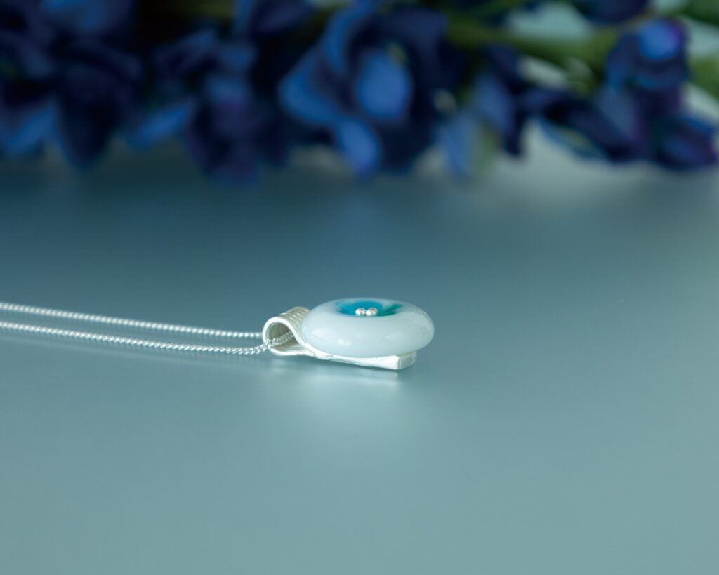 ホワイトカラーの板ガラスに自分好みの模様にフュージングしたガラスパーツを、接着剤を使わない留め方でアクセサリーに仕上げます。