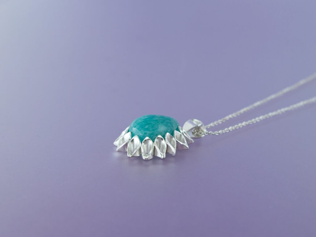 天然石のまわりをゴージャスに装飾したラフカラーの飾り枠は、中世ヨーロッパ貴族の襟元のように伸びやかなデザインで、天然石を華やかに魅せます。
